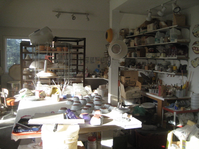 Heidi Grew, clay artist and teacher, this is actually her office at school, not her studio–where I got to pick the piece to go to the YWCA, & the piece I chose: