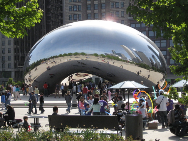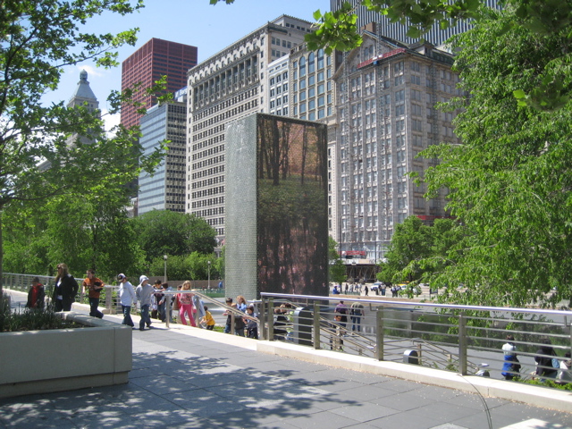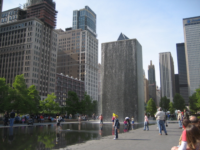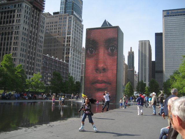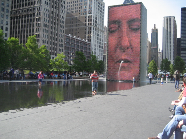The fountain on Michigan Avenue in Millenium Park. Videos of different faces (and other things like trees) are projected on the large monoliths–where the water cascades down. At a certain point the face purses it’s lips and a large stream of water shoots out. Then all the pictures go away and the monolith becomes a waterfall. Every age finds something of fascination here to watch for a bit, or to wade.