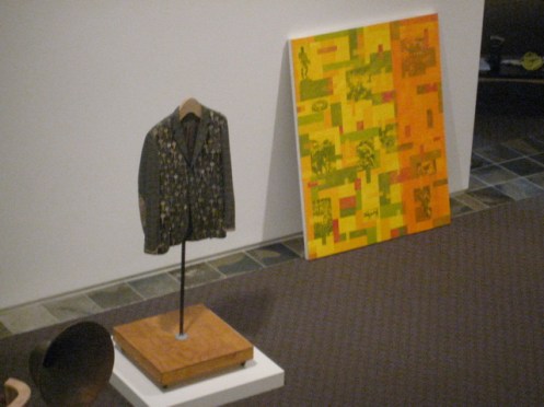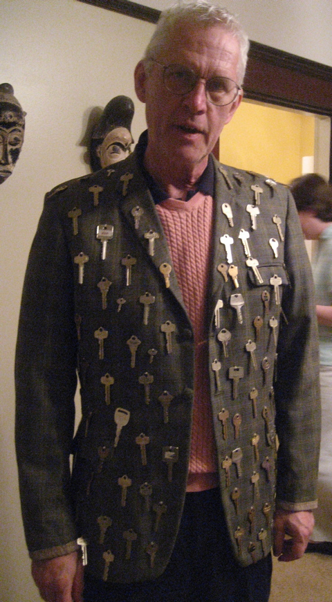 We were in the museum this weekend looking at the Piranesi show and peeked at the installation of sculpture by Andries Fourie. One thing in the show is the key coat, pictured here with an additional earlier photo of Roger WEARING the key coat. Andries hails from South Africa and the coat was his grandfather’s. The show opens this Friday.