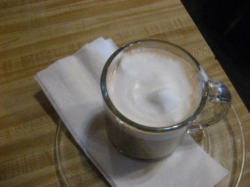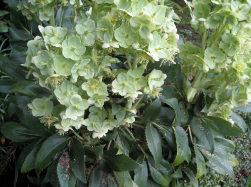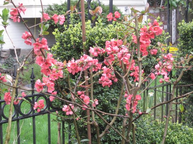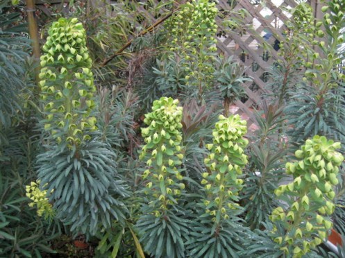 Here are the flowering quince and euphorbias and corsican hellebores in the garden today plus a coffee you’ll see, while representing an alpen snowfield (quote RPH), isn’t very pretty, and is on a fake wood table with a chip which doesn’t enhance the aesthetic. Okay. Here goes: