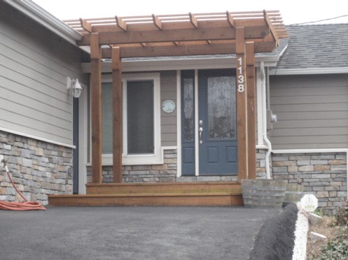 We’re thinking pergola #3 might be the choice–complete with wisteria to replace the dying rhodies. Simple, like the house itself.
