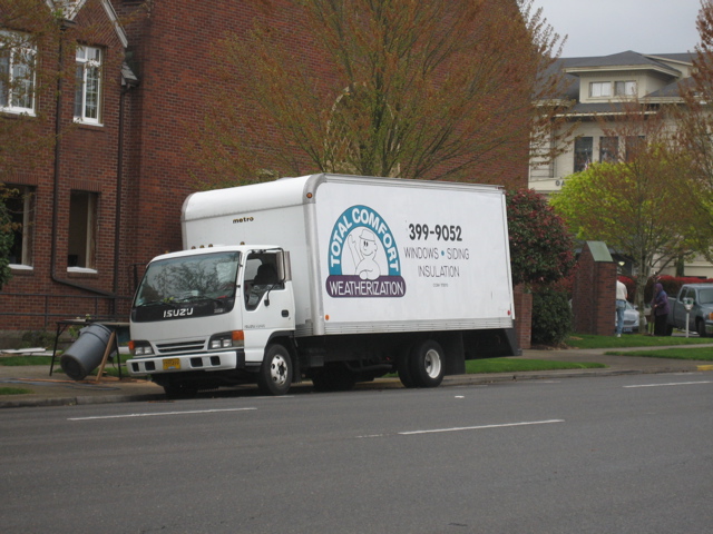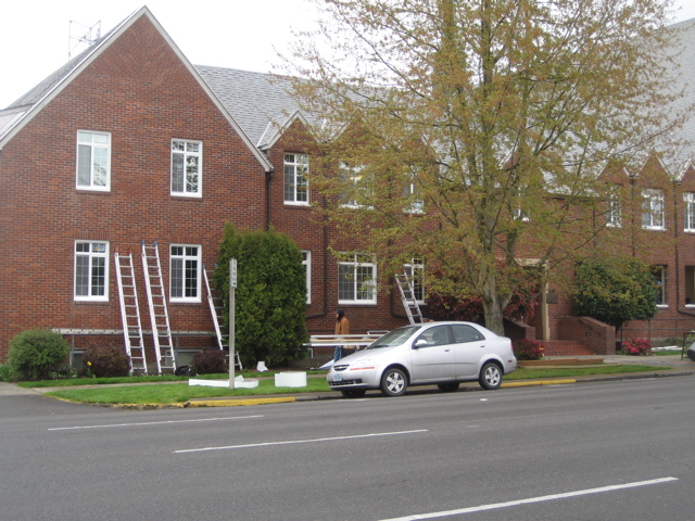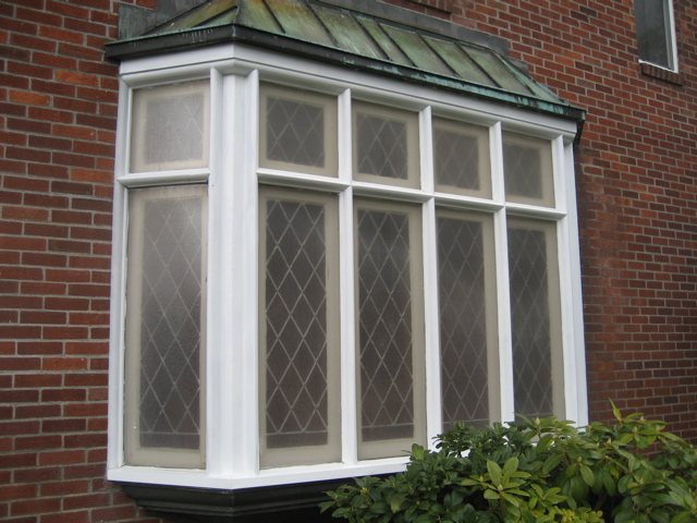 Last week I saw this starting to happen and didn’t have time to take a picture. When I went back today the deed was done–or almost done. A nice old brick church with leaded glass windows–some of them casements. The pattern was a diamond pattern. The whole street side of the church had these windows. But now: EEK!!! The new windows have the snap-in plastic grids.