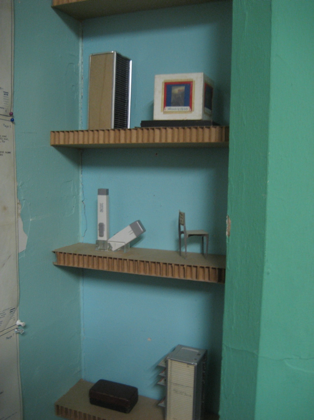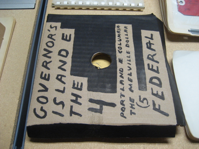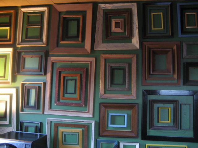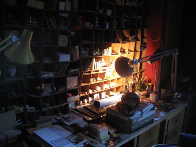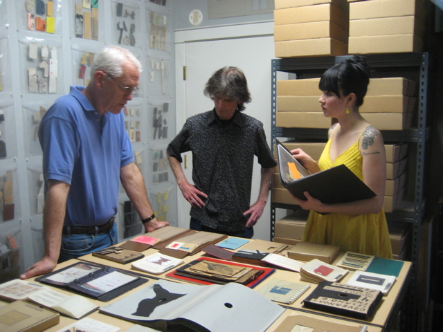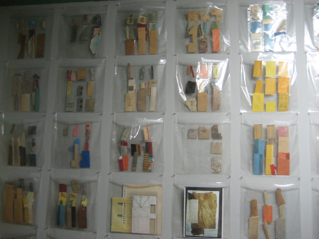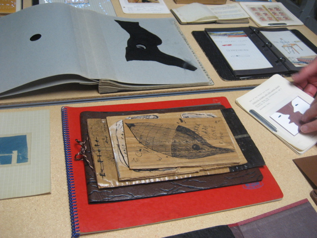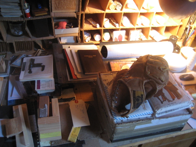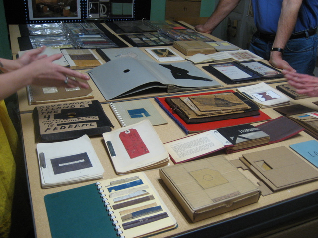 Dan’s desk and one of two “frame walls.” We were there to see the concept that Dan and Alisa had come up with for the show “Artist as Archivist”. Dan has always had an eye for detail and for the way the smallest thing can make into something big. They had put out a range of work, chosen by Alisa, for Roger to look at. It was kind of like Thanksgiving dinner.