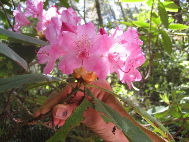Here’s a wild rhododendron, which proliferate in the nature preserve. Sharon is pointing out to me the small dots on the interior of the flower which she described as “bee highway signs”. The dots signal to the bees where they need to go to get the pollen (is that cool or what??).