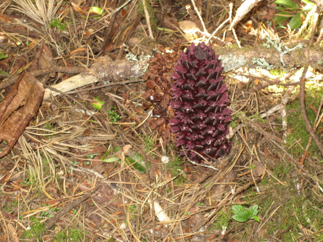 This is a ground cone, Boschniakia hookeri. The purple cone-like item is the new plant with the tiny flowers just visible. The brown cone form behind is last year’s model. This plant is a parasite–it gets all of it’s nourishment from the roots of other plants–most notably salal and kinnikinnick.