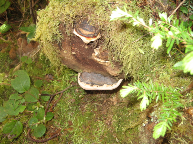 Polyporus oregonensis, or shelf fungi. This one is about 5 years old. The white outer ring is the new growth from this year, then there are earlier sort of orange strips–each one signifying a year.