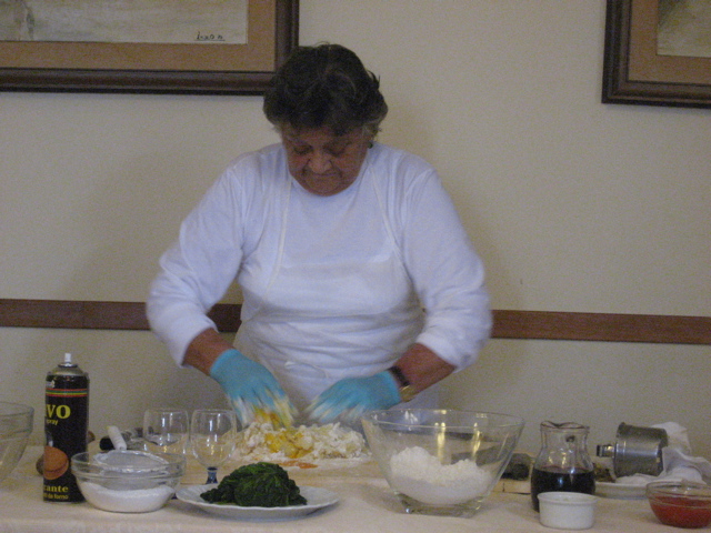 We took a cooking class–given by Francesca who had owned the very fancy restaurant next to our hotel in Cortona. She’s been working in the restaurant for 53 years, and said she was “retired”–she now only works from 6:00 am to 5:00 p.m. She made veal roast, gnocchi and a custard tart, which we then had for luncheon. She moves so fast I could hardly photograph her, but here she is making gnocchi–potato dumplings essentially.