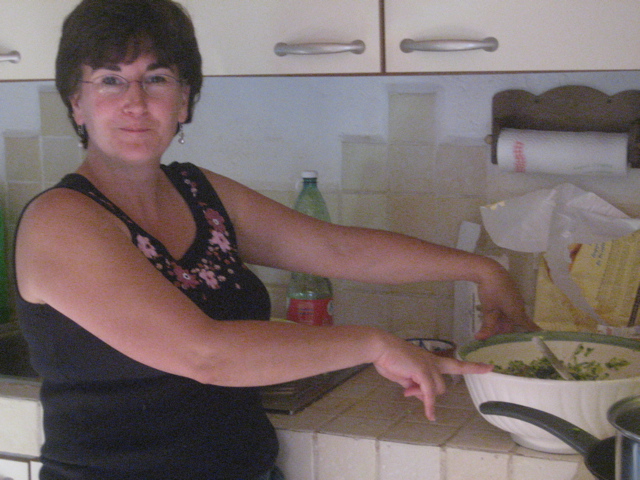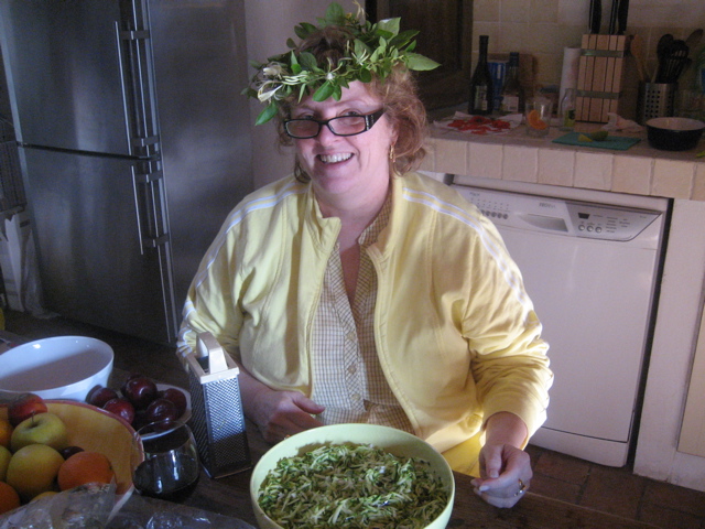 Judy grates the zucchini, Shelley makes the fritatta, Julia makes the salad.