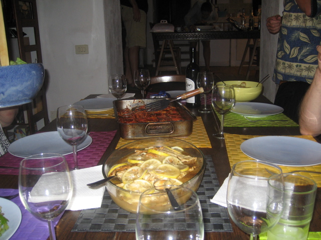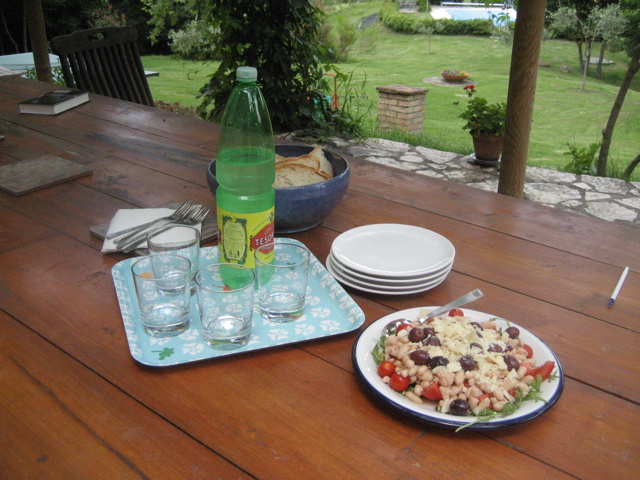 A lunch on the terrace (note the pool in the background), tuna-white bean-arugula-tomotoes-olives-parmesan.