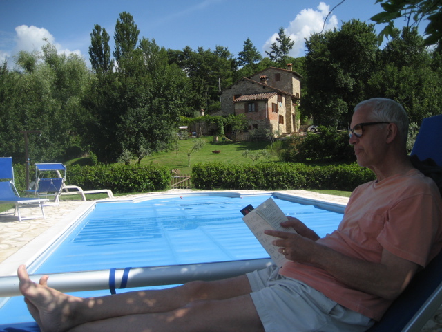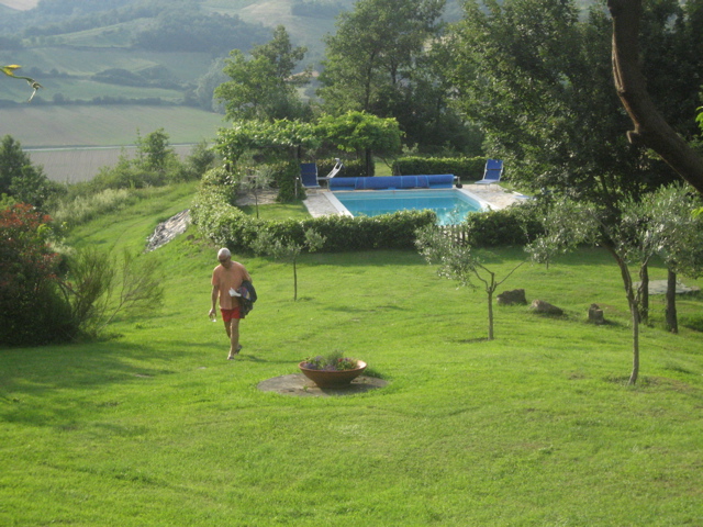 One last blast on Italy, and then it’s time to move on. This year we rented a place in the Umbrian hills east of Cortona. We’ve come to sort of enjoy the touristical one-two punch: first you tour with a group looking at art and Italy, then you repair to the country and relax. We had good cooks, a couple of singers, readers, nappers, artists and some longgg card games…in other words, a perfect vacation! Some of us took a hike around Umbertide and made a side trips to Montepulciano and Sansepulchro and I think all of us just enjoyed our week in the countryside. Here’s where we were: