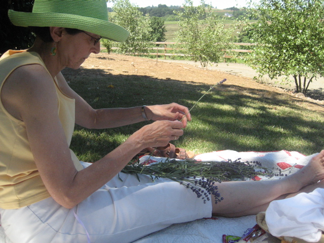 Yikes. We sat on a quilt in the shade and wove pieces of ribbon around the lavender in the age-old way. Start with an odd number of stalks…etc. I was taught by Marylou Green and she was taught by her grandmother, her aunts, her mother. All the women and girls would sit in the Oregon summer shade in the 1930’s and make lavender wands. And so did we.
