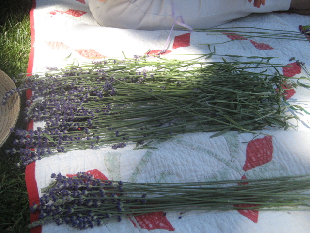 Yikes. We sat on a quilt in the shade and wove pieces of ribbon around the lavender in the age-old way. Start with an odd number of stalks…etc. I was taught by Marylou Green and she was taught by her grandmother, her aunts, her mother. All the women and girls would sit in the Oregon summer shade in the 1930’s and make lavender wands. And so did we.