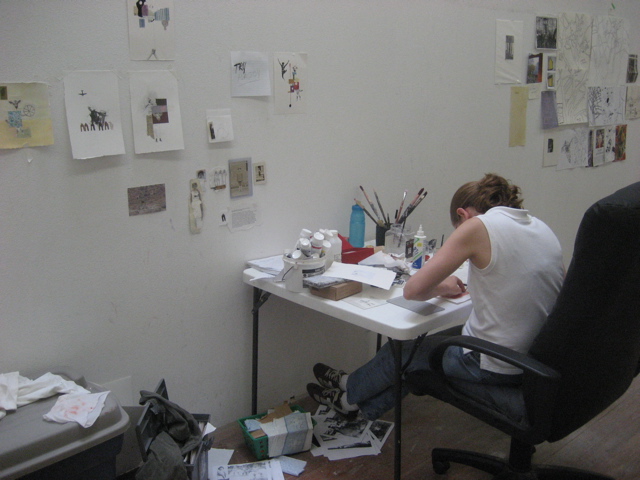 This week I’ve been working on a collaborative project with Laura Mack and Corrie Loomis Dietz. As it has turned out we didn’t actually collaborate on work so much as put stuff up and talk about what we were doing, in a kind of oblique but interesting way. I’ve made a series of “monoprints” using somebody’s leftover paint and then working on top of the painted stripes. My favorite parts of this project have been the small but interesting discussions, the feeling of another energy source in the room, and the large work space. I can see I have to make a change. But here are three of my four “monoprints”