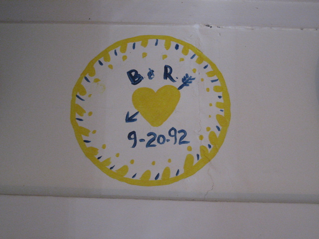 Last year I traced another shadow onto the left-hand cupboard.  This weekend was 16 years since the day we moved in to the beach house on which momentous occasion I painted this ugly, but symbolic, “plate” on the wall.  (September 20th is also our wedding anniversary–9-20-69.)