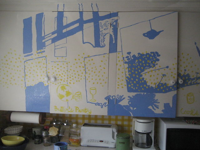 At the beach house you can pretty much do what you want because…well…it’s a beach house.  A few years ago I traced the shadow of the sun coming though the window and making shadow play with the stuff on the sill and, eventually, I painted it blue (the yellow stuff I painted on in 1992 when we got the house–the dots are my finger prints.)