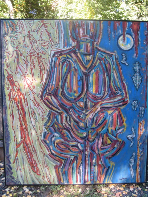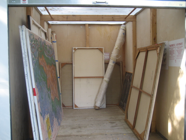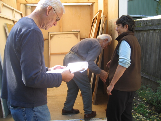 The book is at the designer, the exhibition layout is planned, and soon the work will be collected for Harry’s retrospective show coming up in January, 2009, at the Hallie Ford Museum of Art. Last Friday we visited the Widmans’ and sorted through Harry’s large studio. Roger put his choices of work for the show into a POD, were they will stay until the art transport company takes them down to the museum. The big bonus for the day (besides Mardy’s yummy wild rice soup) was taking the big paintings out in the sun where they popped alive in the light. I think the pictures tell the tale: