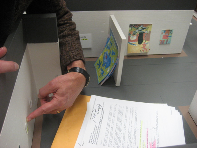 Harry and Mardy came down the other day and we went into the very interesting basement/storage/work area of the museum. David has built models of all the galleries which makes planning the shows a bit easier. This was a chance for Harry and Mardy to begin to really visualize how the show will look in January when it goes up. Here Roger explains the layout as he envisions it: