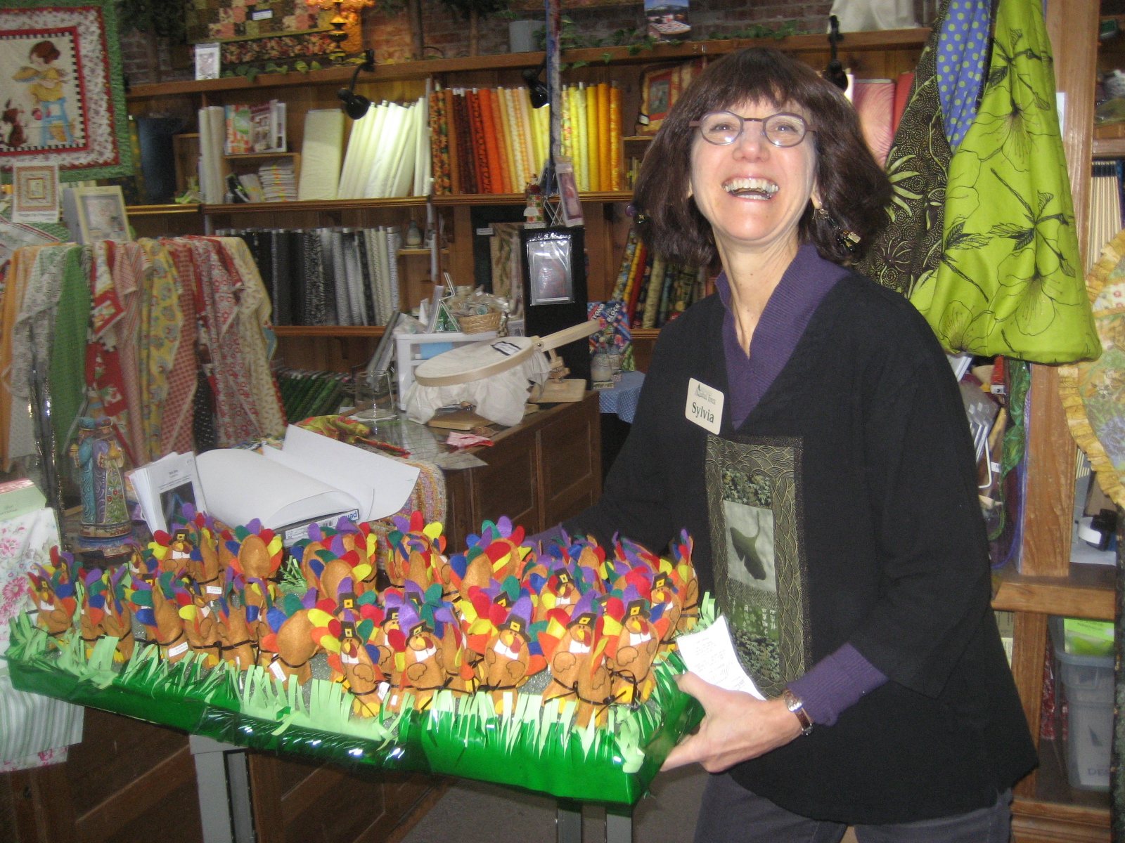 Well the last few years on the friday after Thanksgiving, LeeAnn and I have gone to Greenbaum’s Quilted Forest (our wonderful local quilting store) to get our “Turkey Pops”!! These are Tootsie rolls each with a little felt turkey on it and when you choose one and remove the turkey–VOILA–there’s a real treat, a little printed “prize.” Today mine was 20% off the total of all purchases, so of course I did my best for the local economy. The store is owned by our neighbors Sylvia and Bill and here’s Sylvia offering us a turkey pop….only available to the first 125 through the door!!!! Traditions must be observed!