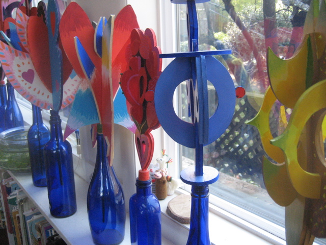 After breakfast we jumped into the car and zoomed to Portland for lunch with George and Phyllis. Sitting at the kitchen table eating soup and talking about cave art, inaugurations, snow storms, etc. I had to remark anew on the “valentines” that line the window sill (all made by George):