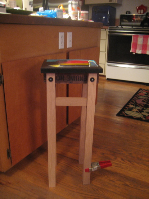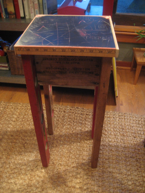I was over at Kay’s today and she’s been making some tables. the first one uses some levels for legs and yard sticks for edging: