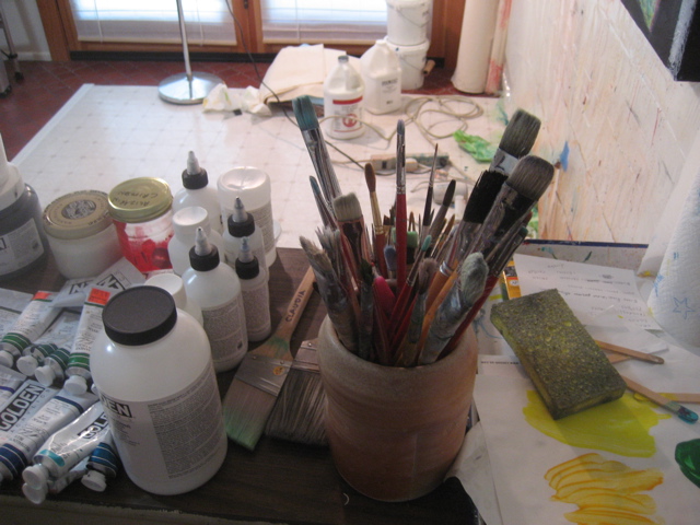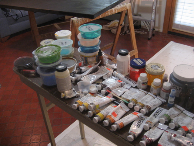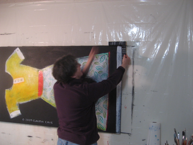 The work of the last 20 years has been lively: meticulously painted gouaches, narratives, stories of the most inventive sort.  In response to current “life developments” Claudia is diving toward the “basic elements” of her painting.  She’s seeking to eliminate excess baggage, eliminate the narrative, seek the beauty of the paint itself applied in this case in a series of layers of colored washes: