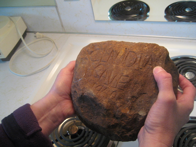 Today I visited Claudia’s studio in Corvallis.  I was returning her “rock.”  The Sherwoods bought the Salem house once owned by Claudia’s parents, and in the garden they found this rock.  Neil knew Claudia was a well known artist and asked me if I knew her, which I luckily do.  The rock appeared on our front porch last week in a bag and today it continued to Corvallis.  Claudia was about 9 when the rock was carved–about 11 when the family moved away.  She has no memory of carving the rock but instantly identified it as her own “work.”  So it remains a mystery, but will find a spot in a Corvallis garden while she checks with Mom and sister for insights into the origin.