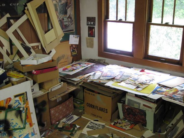 Up in her attic studio she works on the floor creating each collage, and around her are boxes and bins and drawers of raw material collected over a lifetime:
