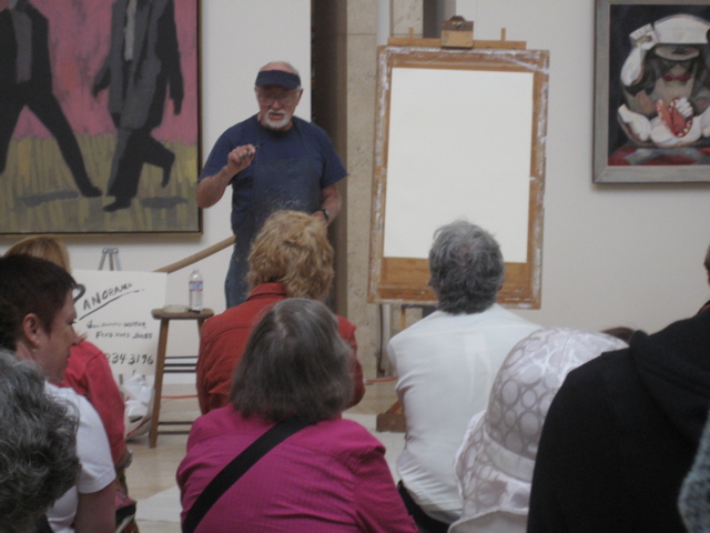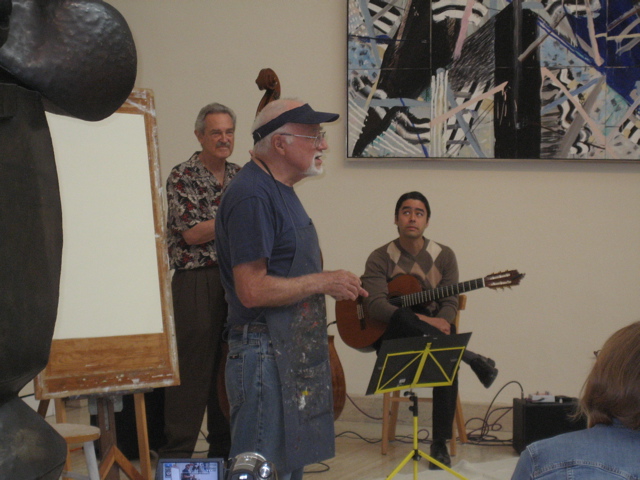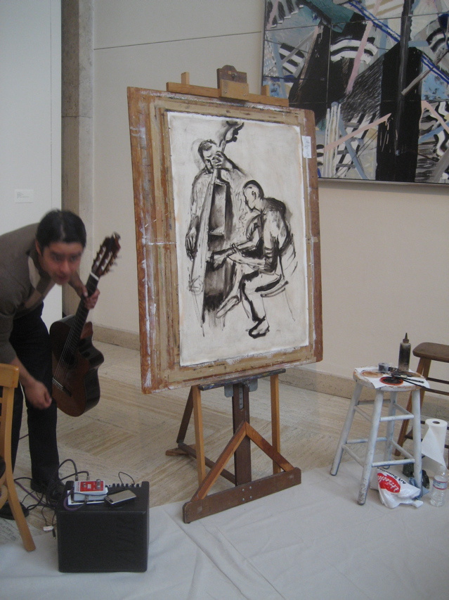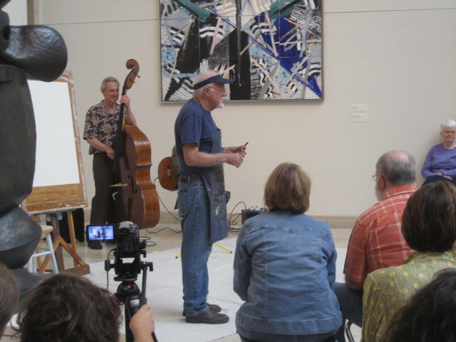 In celebration of the 100th anniversary of the PNCA (Pacific NW College of Art–formerly the Museum School) George Johanson did a demonstration yesterday in the Museum. There was jazz (a bass and a guitar) and George drawing for two hours. Very mellow, very fun. Here’s how it looked: