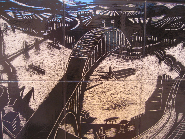 Went up to the Hoffman Gallery at the Oregon College of Arts and Crafts today to see a show of George’s tiled pieces. They are elegantly composed and filled with great details telling us the loveliness of living on the rivers in Portland: