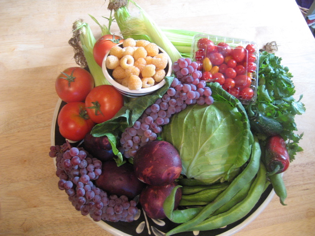Tuesdays are the day the vegetable box arrives from Denison Farms. We’ve taken to getting the box and then planning our meals accordingly. It’s always varied and delicious, but today it was also just beautiful. I knew when I put it in the bag to bring it home that I’d just have to arrange it and look at it before dinner. Think we’ll have some corn, tomatoes, cabbage and white raspberries tonight. But here it is before I start cooking!!