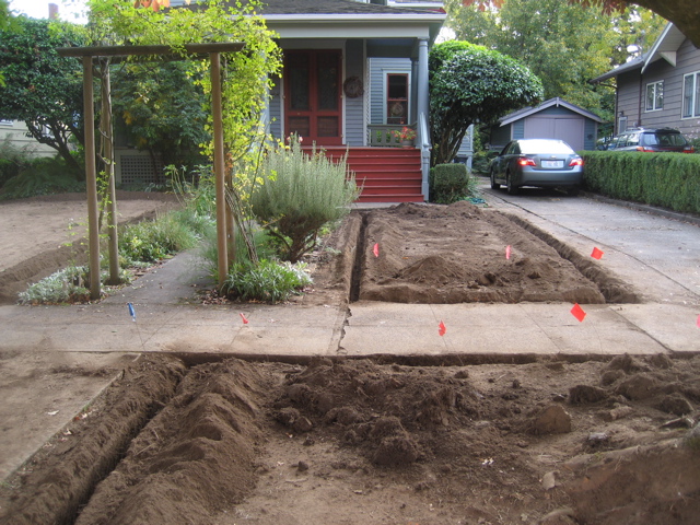 Yesterday was removing the old lawn (hooray!!) and digging the trenches. Today is putting in the sprinkler system pipes. Thursday is the timer and plumbing inspection, Friday the sod goes on. Lately I’ve been writing mostly about art, so this is a little diversion into the reality of life on Court Street. Stay tuned. Think I’ll try and find a drawing of grass I have somewhere for my drawing blog takingalineforawalk. Synchronicity in all things.
