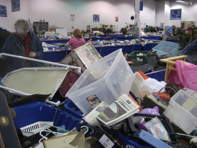 Yesterday three of us went to the Goodwill Bins, an astonishing experience. In a large room there are many many blue bins, all on wheels in rows, all FILLED with junk.