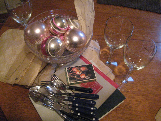 Three new heavy crystal wine glasses for the beach house (to replace the three we broke this summer), some forks and spoons for the beach, a few books and a terrific deck of botannical cards for Christmas gifts (you’re probably glad you aren’t on my gift list when you see this) some old pattern pieces for “works on paper” at the studio, and some old ornaments of my favorite type where the red has faded to pink. Then to the studio went the following:
