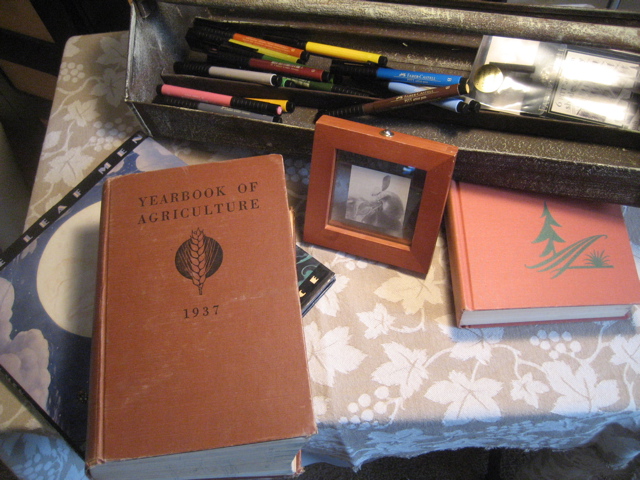 a few more books for inspirational/collage purposes, an old tool box to corral pens and clutter, and a little picture frame to put something in for somebody’s stocking stuffer. All-in-all a fascinating 45 minutes. It’s a treasure hunt–some people rip through throwing stuff everywhere and some people carefully pick to the bottom of the bin (us) to see what we can find: