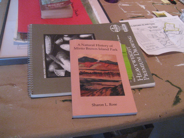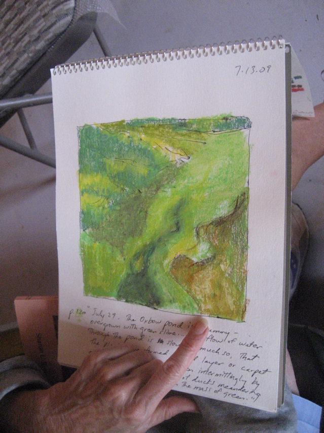 Yesterday Sharon and I went out for a cup of tea to Cynthia’s studio (and home) to see the first few paintings and to look at her sketch book. Her method is to take her dog Lucy and her backpack on her bike and ride the park with a quote or two from Sharon in mind. She then stops, sketches, makes notes. In the studio she works only from the sketches and memory–not from photos. Sharon’s book is organized chronologically through the seasons, starting in September. Cynthia had many questions for Sharon about plants and identifications. Sharon is a biologist/botanist and had interesting answers. I was the lucky bystander.