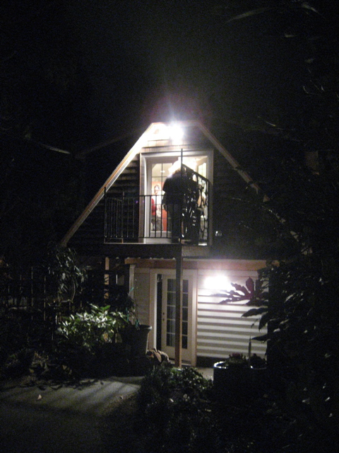 The new space opened up last night with a show of the work of painter John Vandreal who mentored Willamette Student Rachel Sabin in the art of oil painting. Mary Lou and Alan (mostly Alan on the building front…) have built a new space for special exhibitions and the space was jammed last night and glowed in the dark, as did the gallery owner: