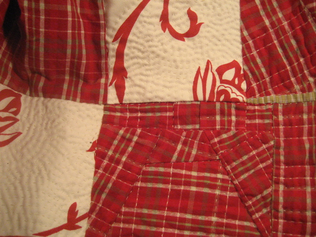 There’s nothing like settling in on a winter evening in a big comfy chair, pulling a quilt onto your lap and just quilting away for an hour or two. It is possibly one of life’s most calming activities (along with freecell). Just now I’m working on a quilt which combines some elegant Dutch fabric (the red and white print) and an old table cloth (red plaid). I’m quilting it all with perle cotton and large stitches. I’ve been looking at a lot of Indian quilts and particularly love the juxtapostion of cut pieces. I figure with the Olympics coming and occasional moments of “American Idol,” I’ll get a lot of quilting done this month!!