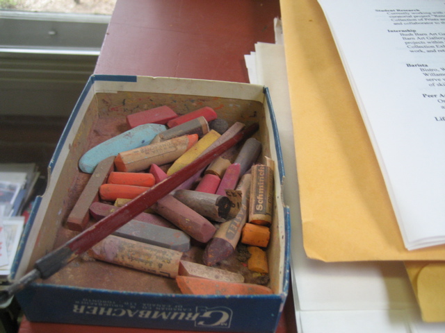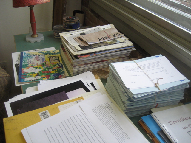 The stuff of which a creative life is made! In the next few months it has to be sorted, archived, donated and tossed. Most of the books will come home to the “new” home office suite and to that end we went over and packed a couple of boxes today. I poked around the office and here’s what I saw: