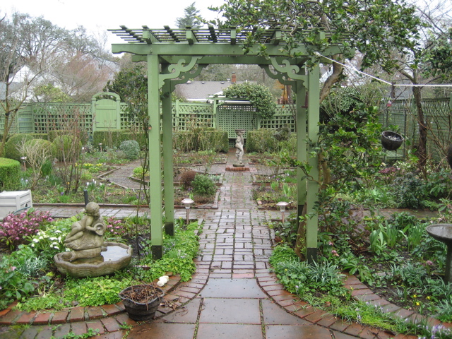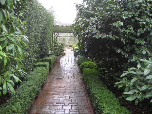 After lunch Salem’s own extraordinary gardener and champion of public gardens in Salem Gretchen Carnaby, spoke about Salem’s own women Landscape architects Elizabeth Lord and Edith Schryver (both graduates of Lowthorpe School of Landscape Architecture) whose landmark practice was established in Salem in 1928.  A few years ago I took some rainy spring photos in the Lord and Schryver “home garden”, the garden they designed for their own house, and tended for many decades.  Here’s the oak allee
