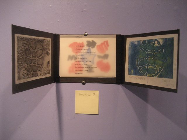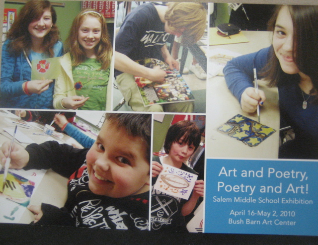 Tomorrow night April 15th is the opening of a wonderful show at Bush Barn Art Gallery of the work of young artists/poets from the 7th grade classes around town. Today I previewed the work of students from Adams/Stephens Middle school and it knocked me out. Each student wrote two poems and made 4 prints. The presentation includes the intaglio plate that each student made and printed from. The poems are wonderful and the prints are magical. Though I have the art teacher’s name I don’t have the poet’s…will have to let you know on that one. Go take a look and see what happens if ipods are ripped out of ears and kids are helped to learn to focus and create. Pure magic.