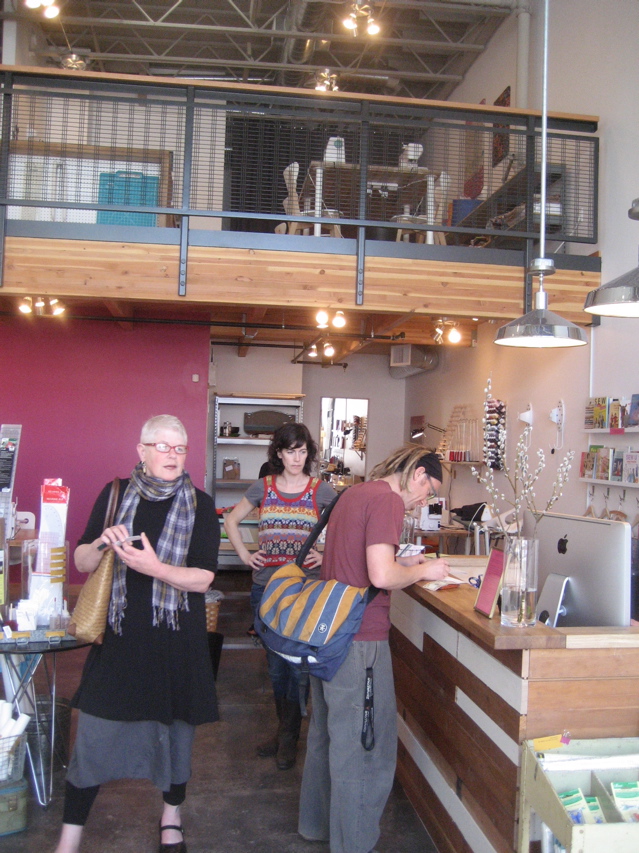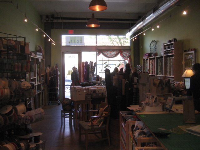 Yesterday Kay and I went to Portland for a day of fabric and fun…a beautiful spring day…no coats were needed. First we stopped in Lake Oswego at a good fabric store called the Pine Needle (no photo, alas), had lunch at the old Papa Haydn’s on Milwaukee, and headed up to Alberta street. We stopped at Modern Domestic to check out a new phenomenon: