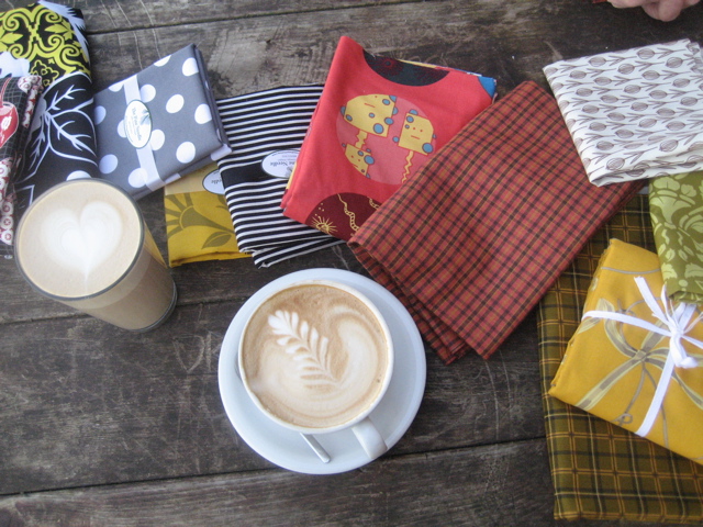 Alberta Street has a wealth of shopping ops and after a few more stops we had a coffee moment and headed over to Albina Press where we knew we could get a beautiful coffee…always important to one of us. We grabbed our coffees and went outside to spread out our fabrics and imagine future projects: