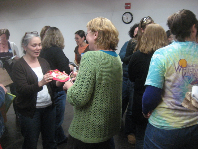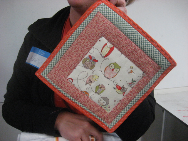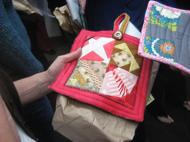 Everyone brought a potholder in a plain brown wrapper, and then grabbed one out of the pot and unwrapped it. Next you were to wander around and find the person who got your potholder. A show and tell followed with each person introducing the maker of the potholder they received. It was fun: