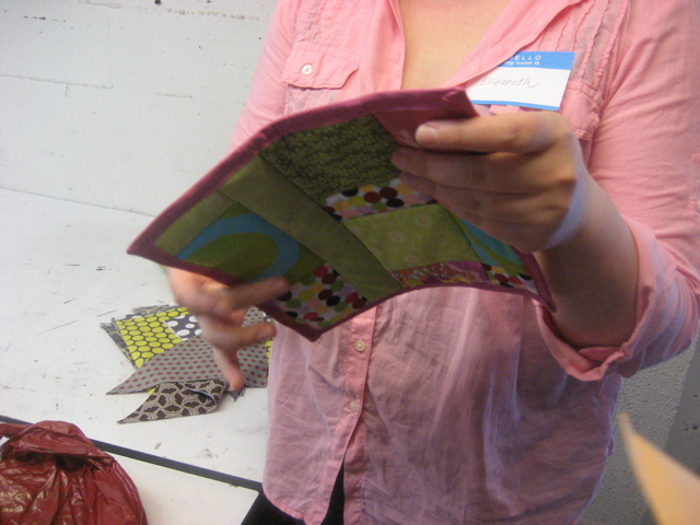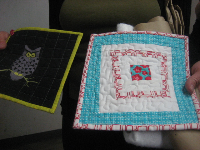 After a trip to Anthopologie and a few lettuce wraps with a glass of wine, we headed to PNCA for the meeting of the Portland Modern Quilt Guild. The Guild’s Portland chapter is just forming and last night they had a potholder exchange