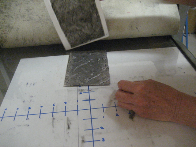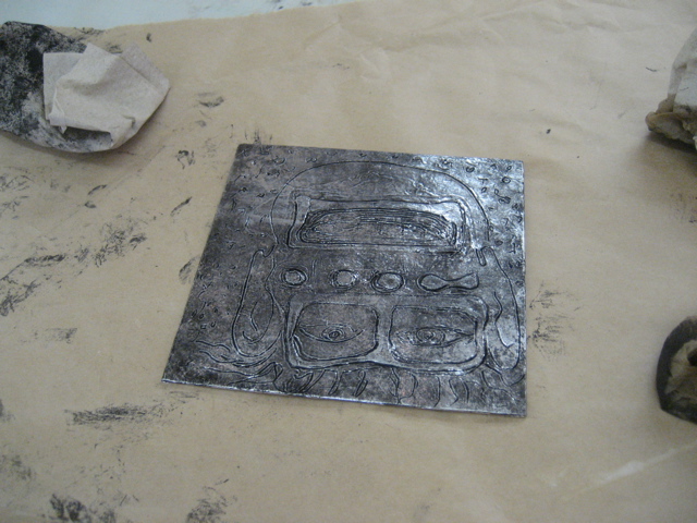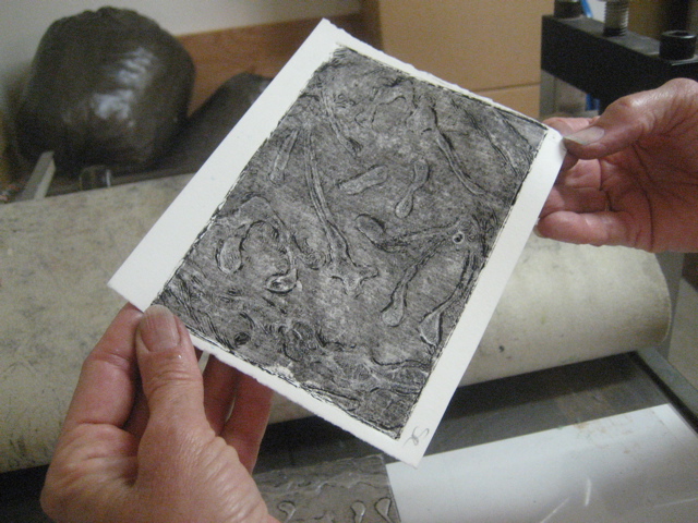 We had all prepared our “plates” for first embossing and then a simple intaglio-like process.  Here’s what it looked like: