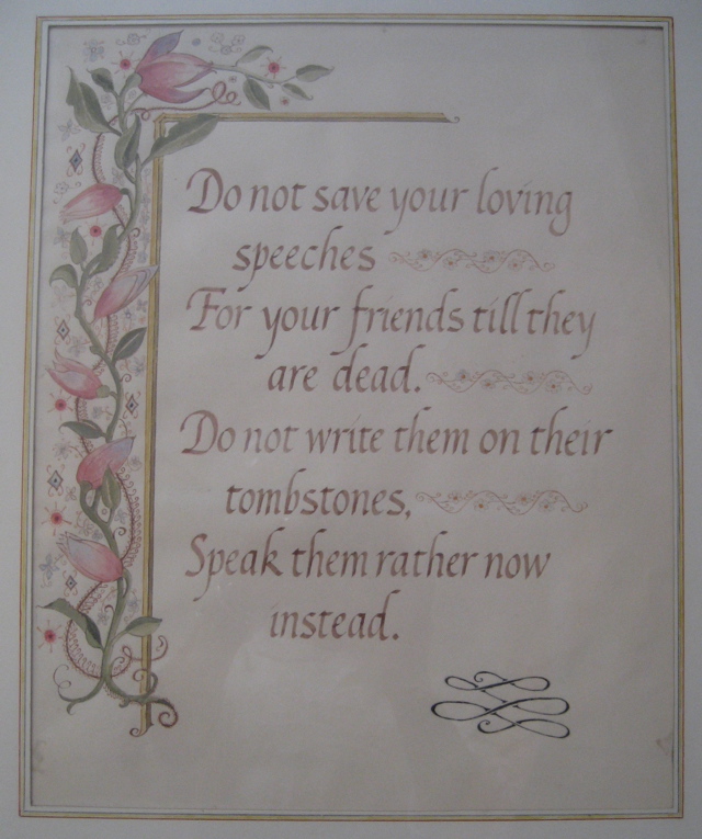 For years Marge was great friends with the Portland painter Charles Heaney, and they often took drives to scout possible locations for paintings. Mr. Heaney was also a calligrapher and for many years Marge kept this calligraphy motto close at hand: