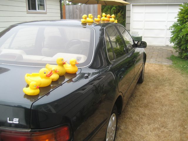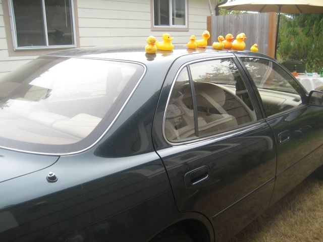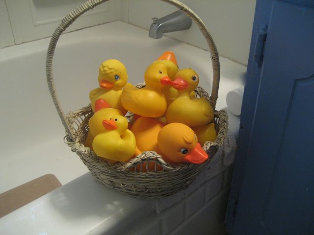 12 rubber duckies smiling in at me.  Woohoo!  After careful consideration and discussion, R felt the caper had Ella written all over.  She confessed to running into a rubber duckie collection at a garage sale and being tempted.  I can’t even describe my delight.  The duckies looked so sweet I left them there and later (driving the OTHER car) went off to the grocery.  When I returned…FIENDS!