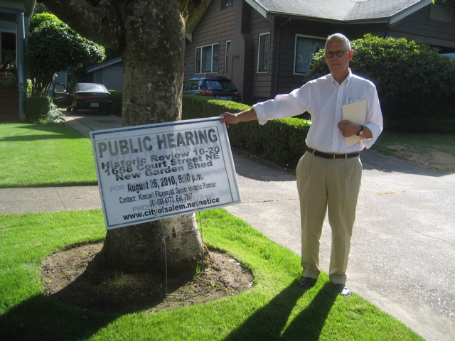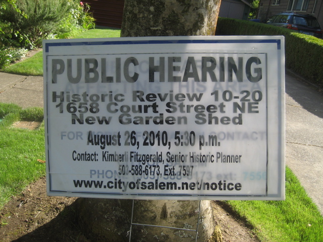 Tonight was our public hearing before Landmarks Commission to get approval for our new desired garden shed. For several weeks we’ve had to display this sign outside the house: