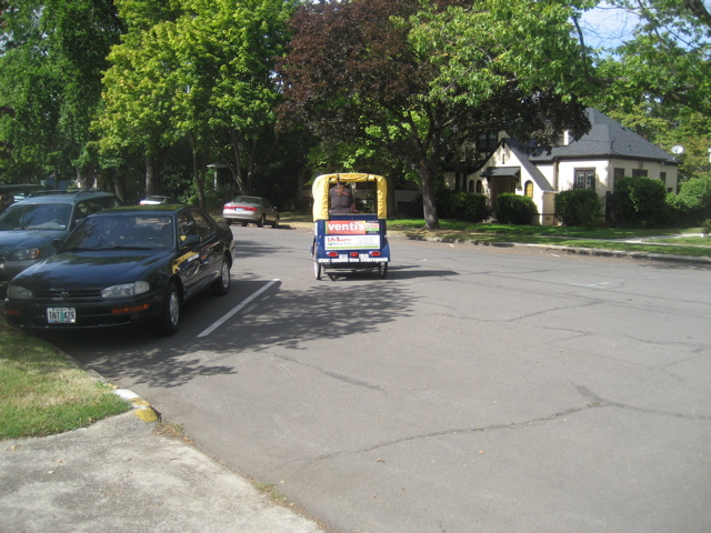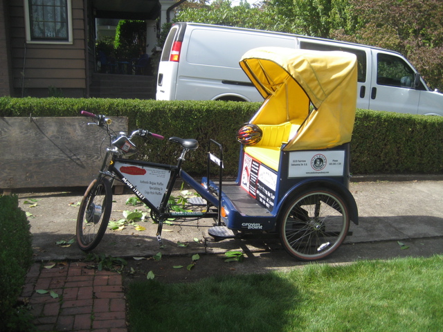 Did you know that Salem has a bike taxi (2 in fact)?? One is always available around town and Michele can pick you up anytime and take you to your destination without burning any carbon fuel. Call her. Michele Darr, Salem Bicycle Taxi at 503-569-7223.