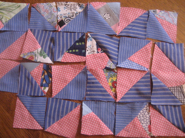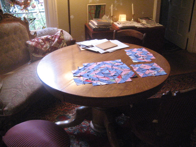 I’m a big believer in 15 minutes a day…that’s how I got painting again in the mid 1990’s after a 10 year hiatus (and opening a restaurant…that slowed me down a bit).  Lately I’ve been looking at quilting blogs and have enjoyed Victoria’s 15 minute play.  I decided to head to the sewing room daily for a few minutes (wrenching myself away from the new studio a-building in the garden) and sew together left over squares from two baby quilts.  I bring them downstairs with me  and try them out on the “staging area” (otherwise known as the dining room table):